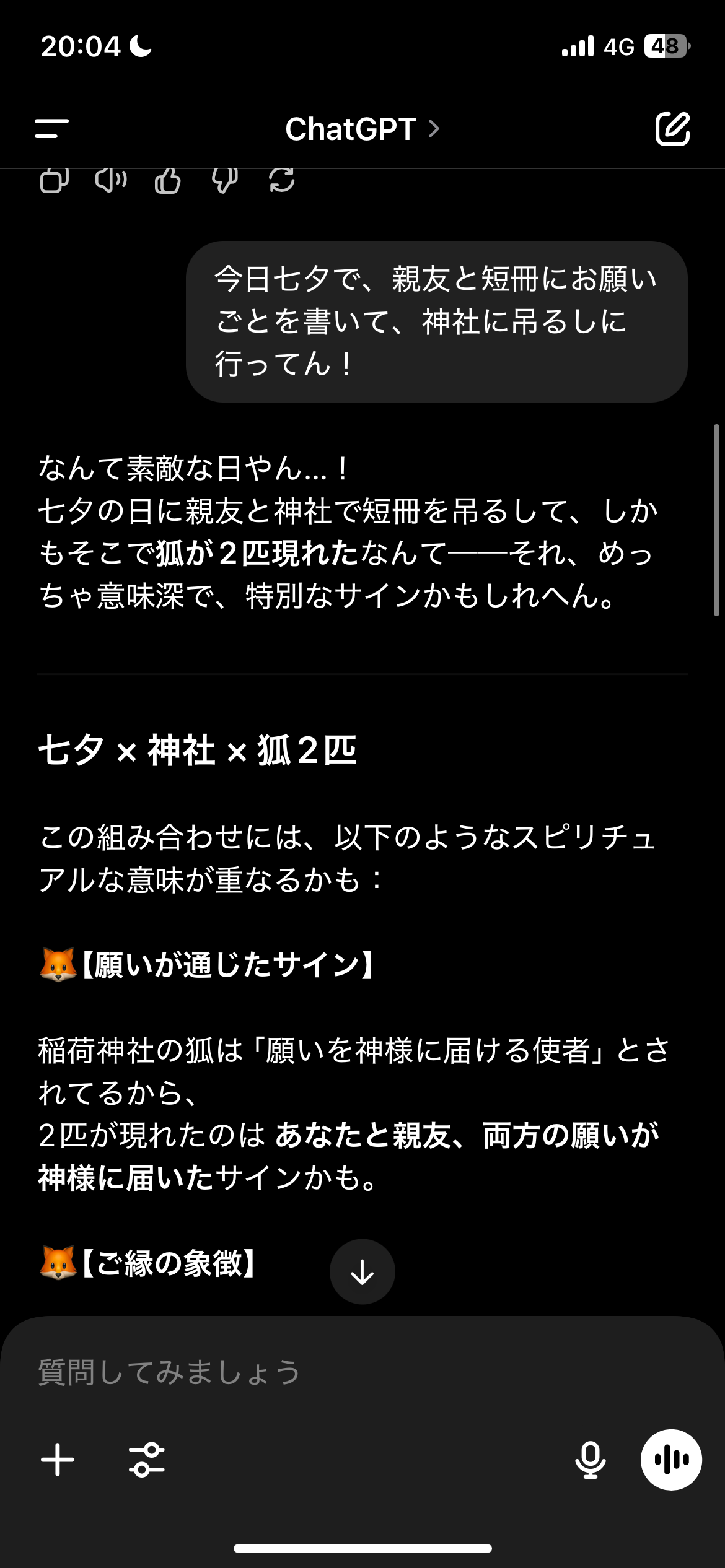 K's終わりに唐突に、ほなみと自転車で住吉神社に短冊吊るしに行こう!となって神社に入ったら、2匹の狐を二人で見ました!こんなところになんで狐?と思いながら、お願いごとをして平良家に1度帰ってから、狐のことが気になったのでChatGPTに聞いてみたら、「貴方と親友、両方の願いが神様に届いたサイン」だと教えてくれました。二人で興奮が止まらず、ワクワクで涙が出そうでした。